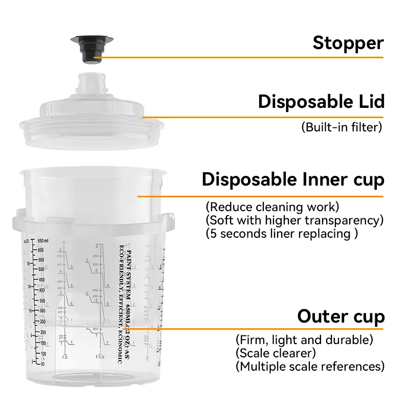 200ml डिस्पोजेबल स्प्रे कप एक डिस्पोजेबल पेंट कप सिस्टम है जिसे 1-पैनल मरम्मत के लिए डिज़ाइन किया गया है, यह 6.8 fl oz (200 mL) या कम सामग्री की आवश्यकता वाले क्षेत्रों के लिए उपयुक्त है। इसने AYS1.0 श्रृंखला के आधार पर बाहरी कप डिजाइन को अपग्रेड किया है। एकीकृत बाहरी कप लॉक कॉलर भागों के बिना करता है, जो विधानसभा और स्प्रे कप के डिस्सैम को आसान बनाता है; AYS3.1 सीरीज़ पेंट कप सिस्टम AYSPAT का न्यूस्ट डिस्पोजेबल स्प्रे गन कप है, जो पेंट मिक्सिंग, स्प्रेइंग और स्टोरेज की पूरी प्रक्रिया की दक्षता और गुणवत्ता में काफी सुधार करता है।
