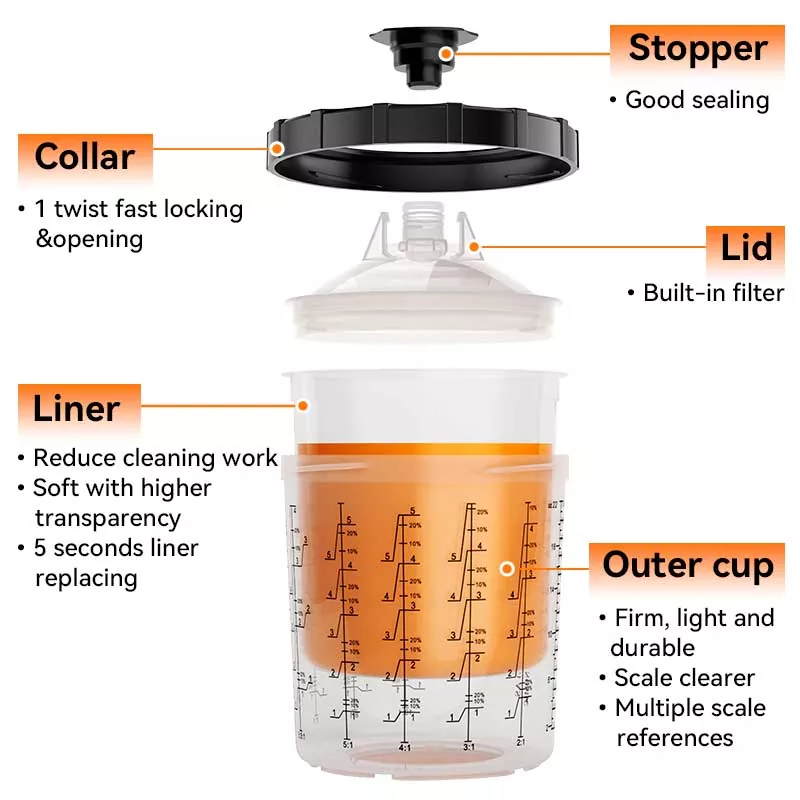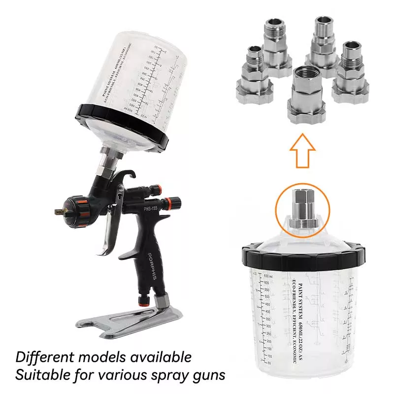 यह 400ML डिस्पोजेबल पेंट कप सिस्टम 1.0 मूल रूप से पारंपरिक ग्रेविटी फीड कप की जगह लेता है क्योंकि यह न केवल अधिक पेंट बचाता है, बल्कि पेंटिंग की दक्षता में भी सुधार करता है। विशेष रूप से, पेंटिंग करते समय लाइनर के स्वचालित सर्पिल डाउन का उत्कृष्ट डिज़ाइन पेंट का पूरी तरह से उपयोग करता है; इस बीच, त्वरित लॉकिंग प्लस लाइनर रिप्लेसमेंट डिज़ाइन कप को धोने से बचाता है, जिससे पेंटिंग का काम कुशलतापूर्वक और बार-बार किया जा सकता है। विभिन्न स्प्रे गन उत्साही लोगों की अनुभव आवश्यकताओं को पूरा करने के लिए हमारे पास बाजार में स्प्रे गन के लगभग सभी ब्रांडों के लिए एडाप्टर हैं। एडॉप्टर स्टेनलेस स्टील से बना है, जो पेंट के जंग के प्रति प्रतिरोधी है और बहुत टिकाऊ है। ढक्कन के साथ लाइनर का कड़ा संयोजन यह सुनिश्चित करता है कि पेंटिंग करते समय कप सिस्टम से पेंट लीक न हो, और बर्बादी से बचने के लिए अप्रयुक्त पेंट के दीर्घकालिक भंडारण का समर्थन करता है।