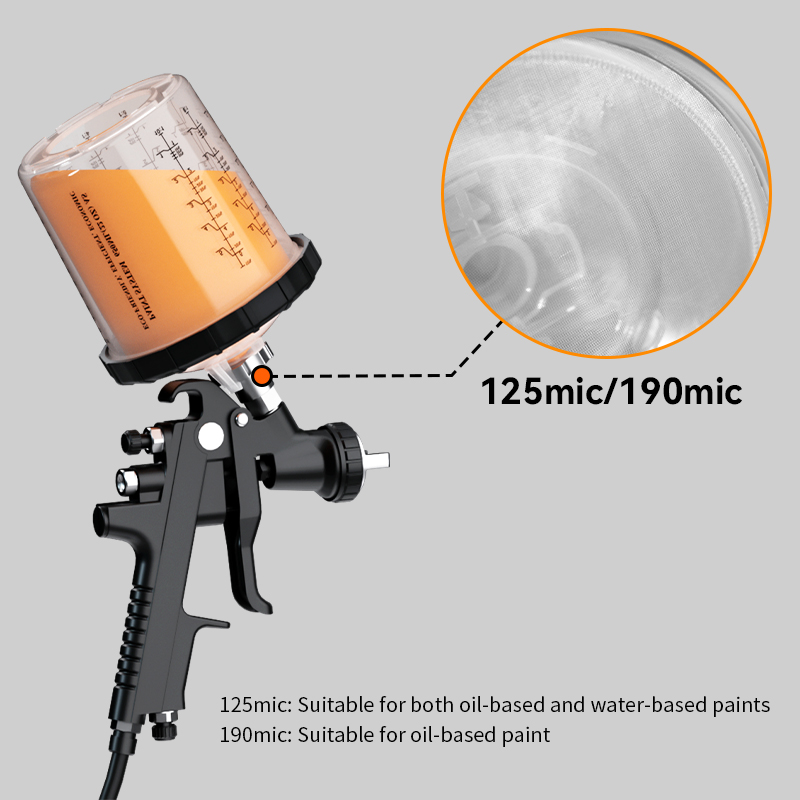 • बेहतर पेंट फ़िनिश के लिए अंतर्निर्मित एकीकृत फ़िल्टर: डिस्पोजेबल स्प्रे कप कैप में बिल्ट-इन 190μ (तेल-आधारित पेंट) और 125μ (पानी-आधारित पेंट) फिल्टर हैं, जो छिड़काव के दौरान अशुद्धियों को प्रभावी ढंग से फ़िल्टर करते हैं और पेंट की चमक को 20% तक बढ़ाते हैं।