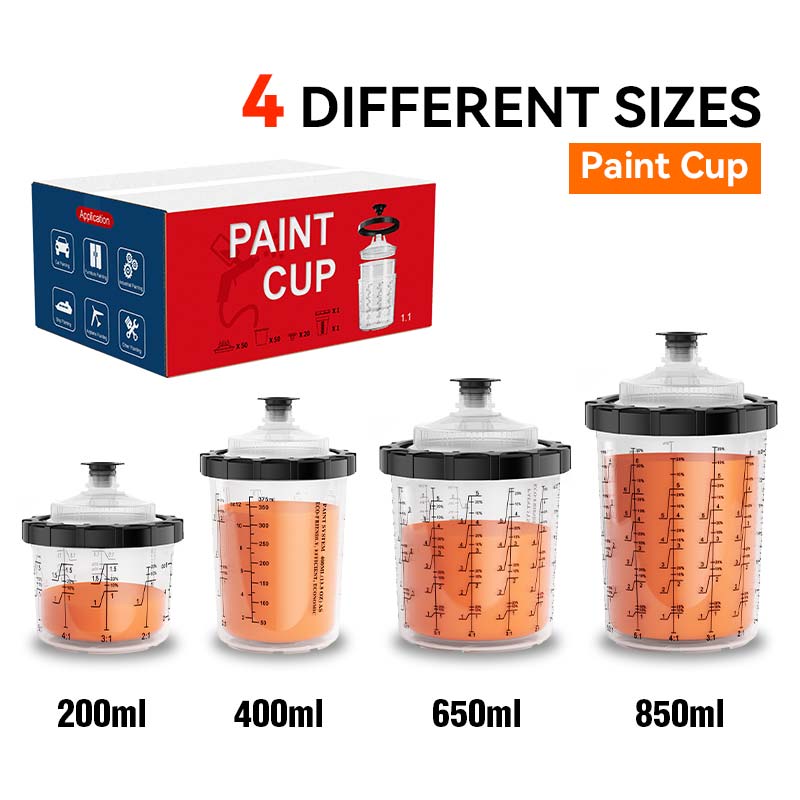 बाजार अनुसंधान के आधार पर, पेंट कप चार क्षमता विनिर्देशों में उपलब्ध है: 200ml, 400ml, 650ml, और 850ml, विभिन्न उपयोग परिदृश्यों के लिए खानपान, चाहे बड़े क्षेत्र के छिड़काव के लिए या विस्तृत टच-अप। इसके अतिरिक्त, आंतरिक कप संरचना को चिकनी पेंट प्रवाह सुनिश्चित करने के लिए अनुकूलित किया गया है, क्लॉगिंग और अपशिष्ट को कम करना।
